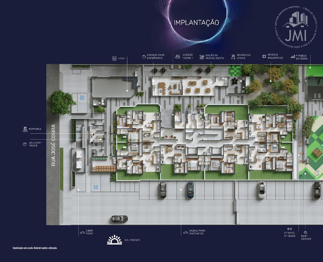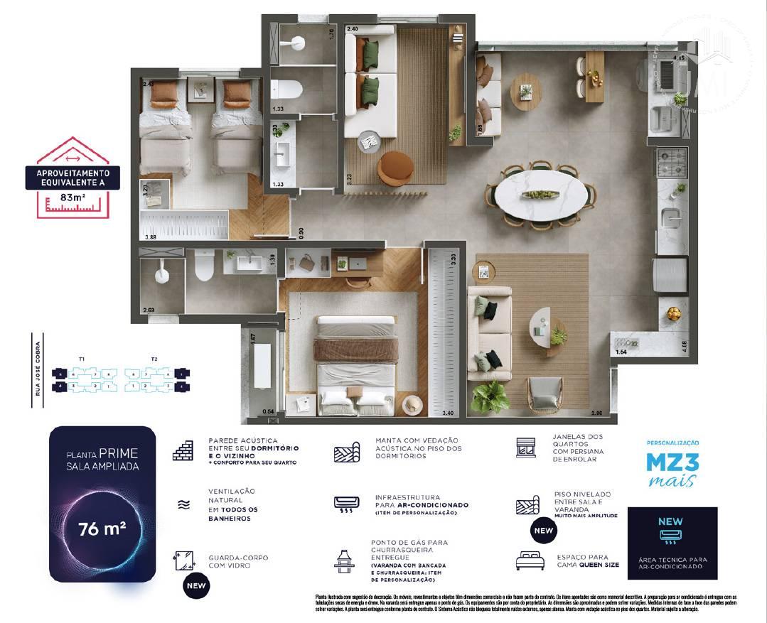 O imóvel tem 3 quartos, sendo 1 suíte, possui 2 banheiros e 2 vagas de garagem.76,63m² de área útil.